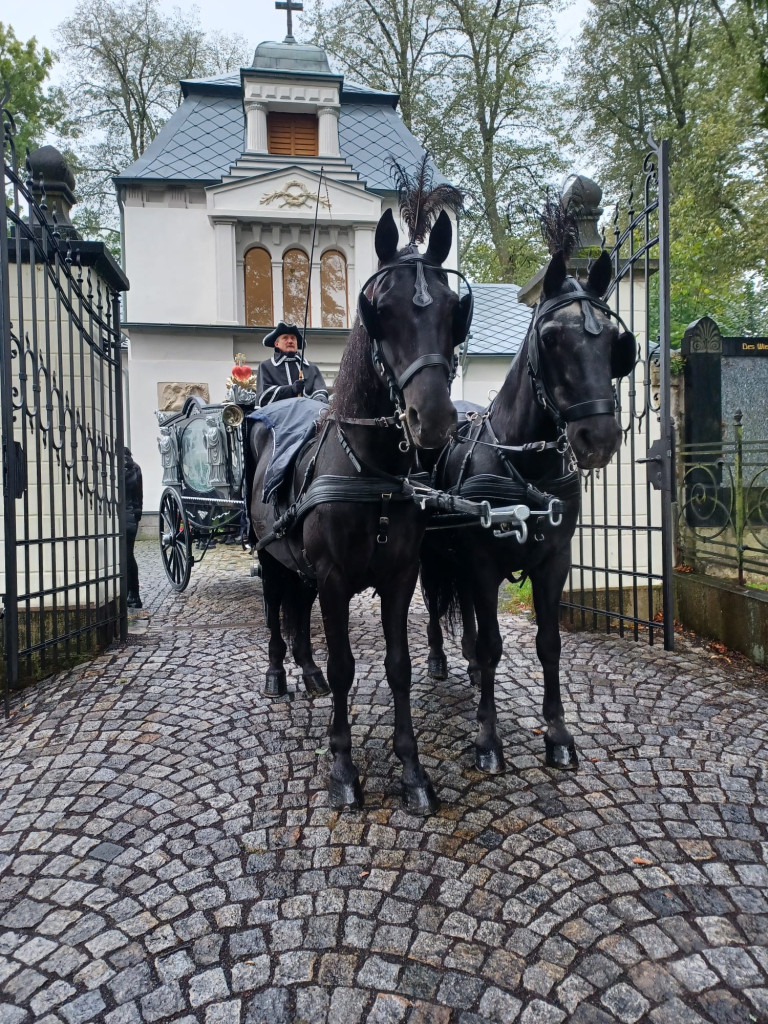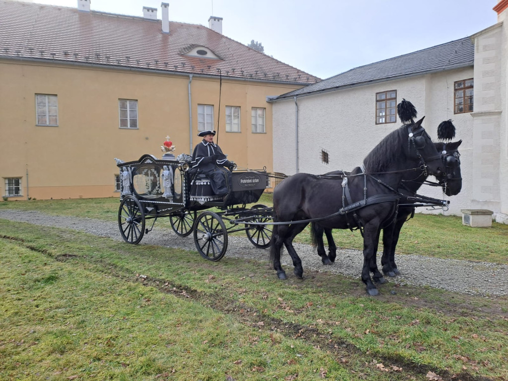 Ve spolupráci s pohřebním ústavem Josefa Kňourka a naší stájí zajišťujeme důstojný průběh události s důrazem na profesionalitu a individuální přístup k našim klientům. Naši koně i kočar zajišťují výjimečný estetický a citlivý doprovod na poslední cestě.
