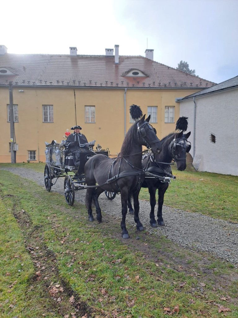 - Tažní koně: Vybraní starokladrubští koně z naší stáje, kteří jsou špičkově připraveni na ceremoniální události.